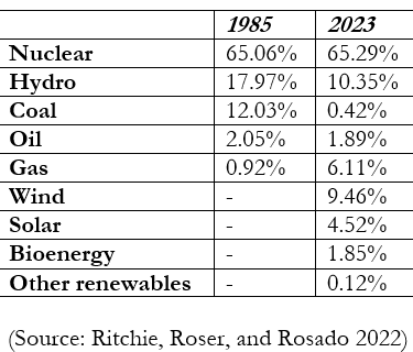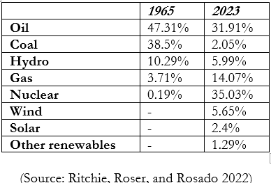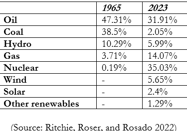 3.3 On a national level, French energy consumption between 1965 and 2023 grew by about 79% from 1,347 terawatt-hours (“TWh”) to 2,407 TWh (Ritchie, Roser, and Rosado 2022). The following table summarizes the changes in consumption by proportion and source.