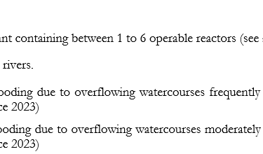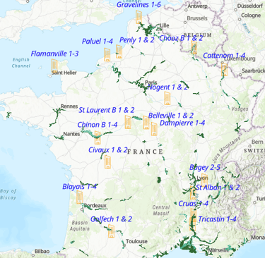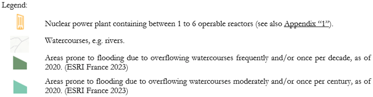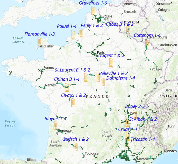 8.1 As of February 2025, there are 57 operable nuclear reactors in France, which locations are depicted in the GIS map above. The vast majority are situated along watercourses and/or close to the coast. Nearshore plants are susceptible to the effects of sea level rise (see section C above) while those along watercourses may experience flood risk, as indicated in the legend above, and/or low water levels in times of drought or water scarcity.