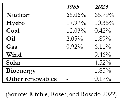 4.2 National energy production between 1985 and 2023 has seen an upswing of about 52% from 337.67 TWh to 514.11 TWh (Ritchie, Roser, and Rosado 2022). The following table summarizes the changes in production by proportion and source.