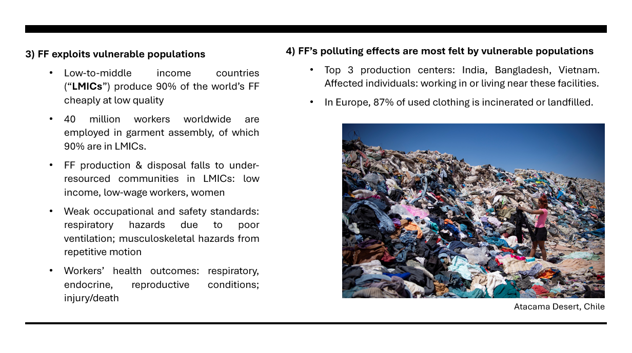 Image credits: Rana Plaza (https://acsclothing.co.uk/rana-plaza-10-years-on/); Chilean landfill (https://www.aljazeera.com/gallery/2021/11/8/chiles-desert-dumping-ground-for-fast-fashion-leftovers)
